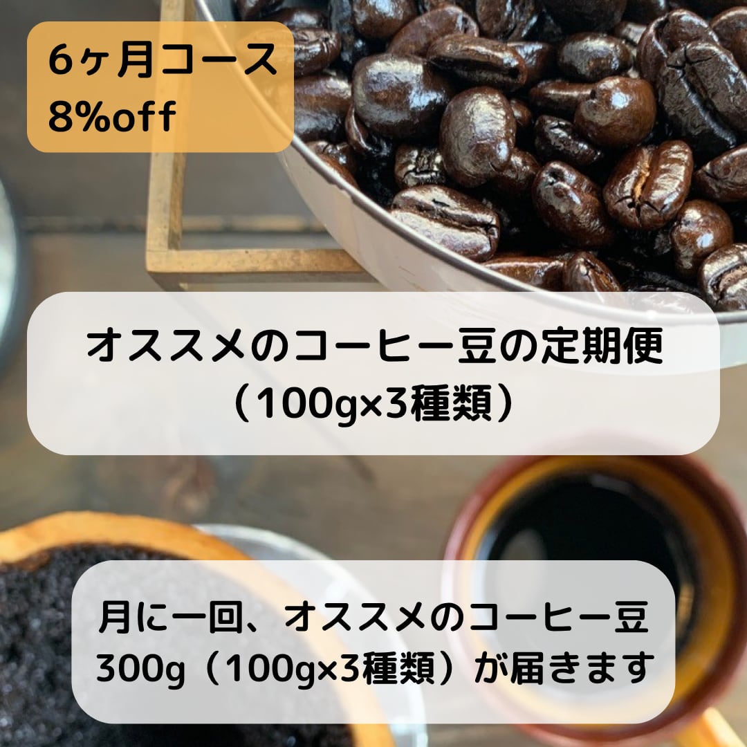 通常の販売価格の約8%OFFで、オススメの組み合わせのコーヒー豆300g(100g×3種類)が月に一回、6ヵ月届く定期便です。